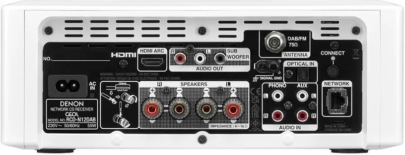 Denon RCD N12DAB оснащен большим количеством встроенных источников сигнала. Здесь имеются CD-плеер с быстрой загрузкой диска и практически бесшумно работающим механизмом, а также очень качественный FM/AM тюнер. Однако это является лишь частью списка возможностей данной модели, большинство из которых связаны с сетевым функционалом Denon RCD N12DAB. Здесь предусмотрено воспроизведение музыкальных файлов как с различных устройств (подключение к сети по Ethernet или Wi-Fi), а также пользование различными online-сервисами. Denon RCD N12DAB можно включить в беспроводную фирменную систему мультирум HEOS, а также соединять напрямую с устройствами, поддерживающими технологию AirPlay/AirPlay 2. Вход HDMI поддерживает возвратный аудиоканал ARC, что удобно при подключении к телевизору. На борту имеется MM-фонокорректор. Также в системе предусмотрен Bluetooth и имеется USB-вход для подключения портативных накопителей.