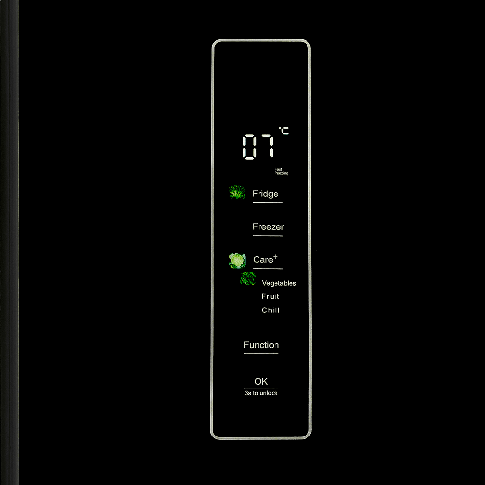При внушительной общей вместимости модель остаётся комфортной в повседневном использовании: уровень шума 37 дБ подходит для кухни-гостиной, а сенсорная панель на фасаде даёт быстрый доступ к основным режимам — от «Быстрого охлаждения» до «Eco».