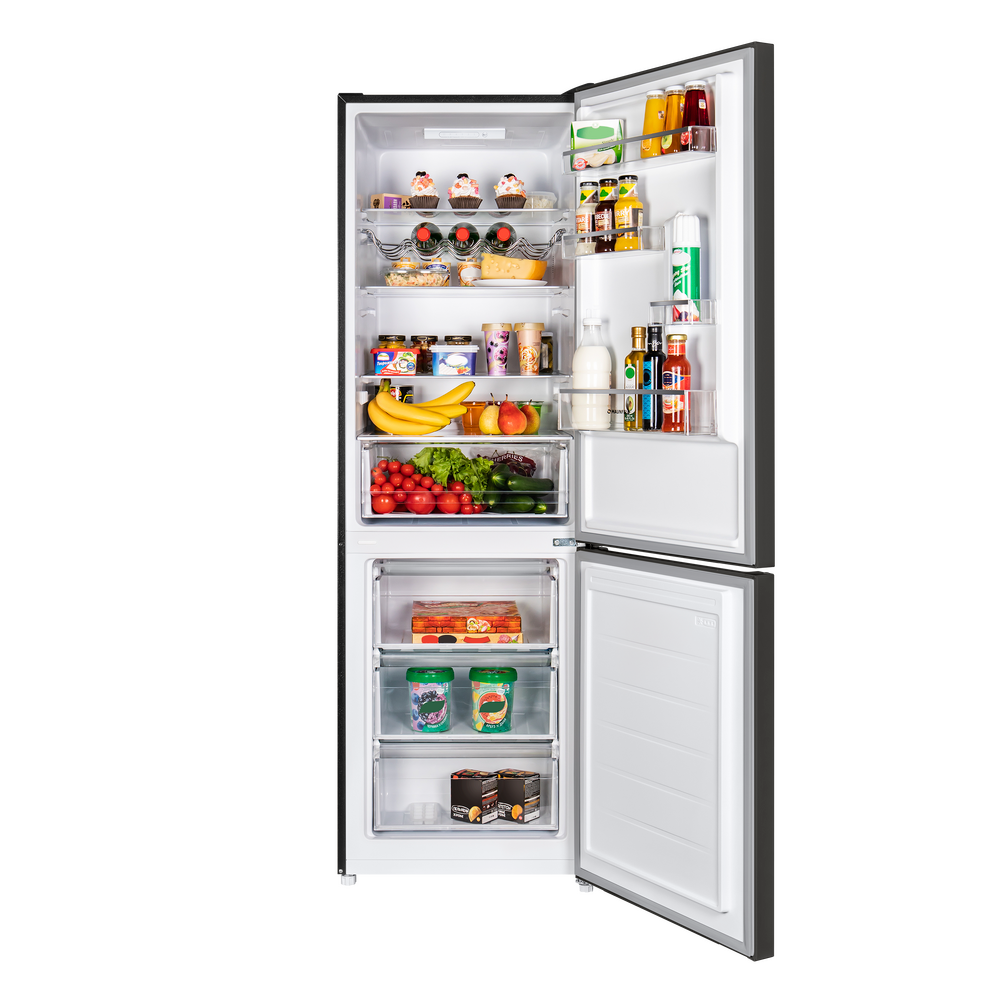 Двухкамерная конструкция с верхней холодильной (213 л) и нижней морозильной (104 л) камерами обеспечивает продуманную организацию хранения. В холодильном отделении предусмотрены стеклянные полки с металлической окантовкой, большая корзина для фруктов и овощей, боковые полки на дверце, решетка для бутылок и лотки для яиц. Низкий уровень шума 39 дБ делает MAUNFELD MFF185SFSB комфортным для кухни-гостиной.