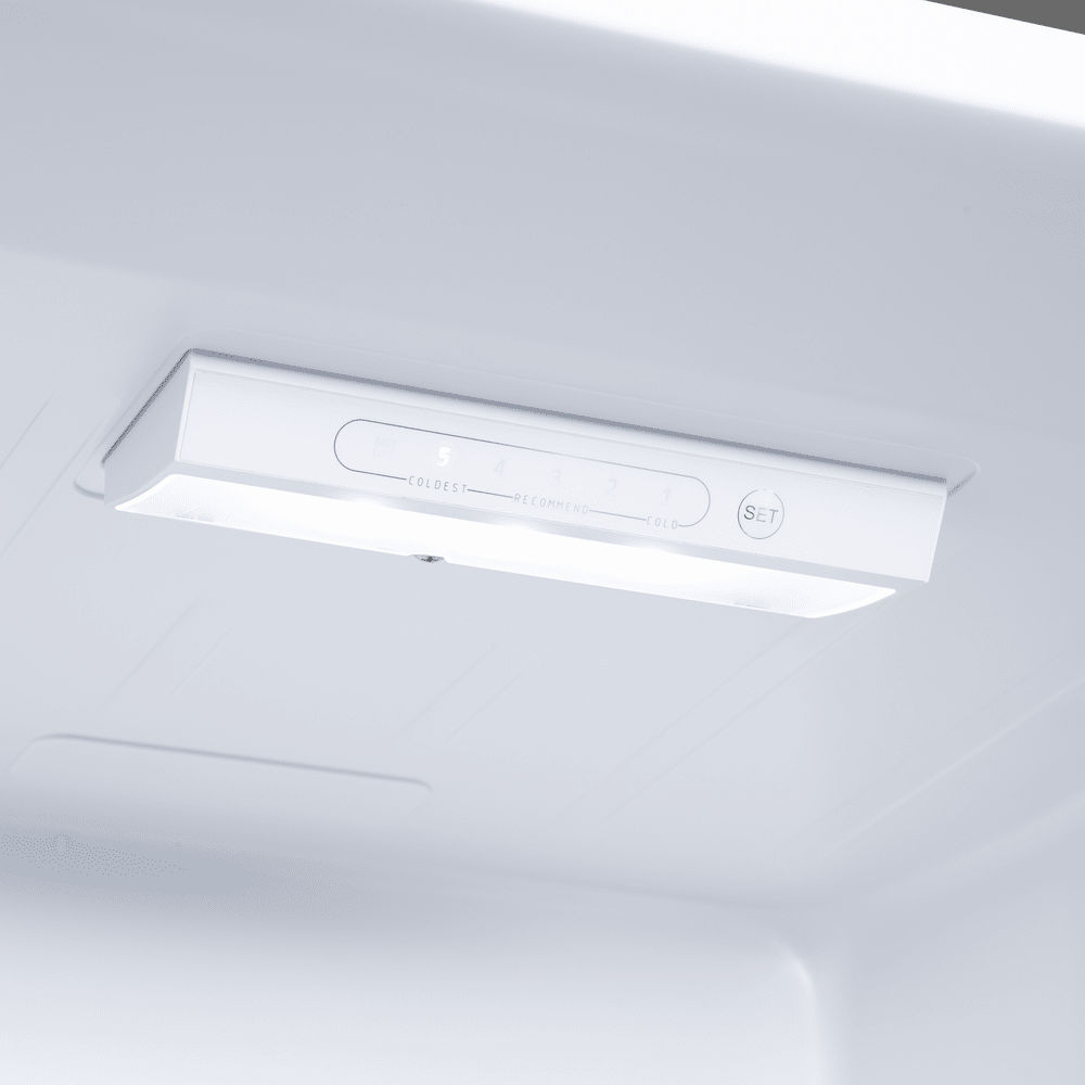 Сенсорное управление на верхнем дисплее позволяет задавать температуру от +2°C до +8°C и активировать быстрое охлаждение морозильной камеры. Система SmartFrost уменьшает образование инея, а полезные функции — сигнализация открытой двери, восстановление режима и задержка включения компрессора после перебоя питания — заботятся о сохранности продуктов.