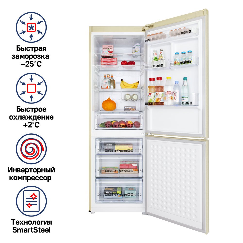 Вместительный 2-х дверный холодильник с умно организованным внутренним пространством для хранения разных типов продуктов. Сенсорная панель с интеллектуальным управлением. С ней вы сможете установить температуру каждого отсека по отдельности. Передовые технологии — уровень шума 37 дБ. Модель оборудована инверторным компрессором , который позволяет экономить электроэнергию и снижает уровень шума. Хладагент R600A "Зеленые" технологии — абсолютно безвреден для окружающей среды, экономичен и энергоэффективен. Такой хладагент не причиняет вреда озоновому слою. Функция "Быстрое охлаждение" позволит надолго сохранить свежесть большого количества продуктов. Функция быстрой заморозки способствует сохранению свежести и витаминов в продуктах, хранящихся в морозильной камере.