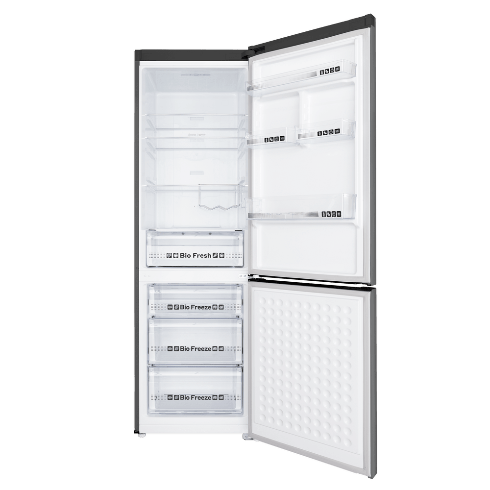 Внутри предусмотрено удобное разделение: в холодильной камере 232 л — стеклянные полки, большой ящик для овощей и фруктов и продуманная дверная зона; в морозильной камере 98 л — выдвижные ящики для быстрого доступа. Благодаря инверторному компрессору модель работает ровно и экономично, а низкий уровень шума 37 дБ комфортен для кухонь-гостиных.