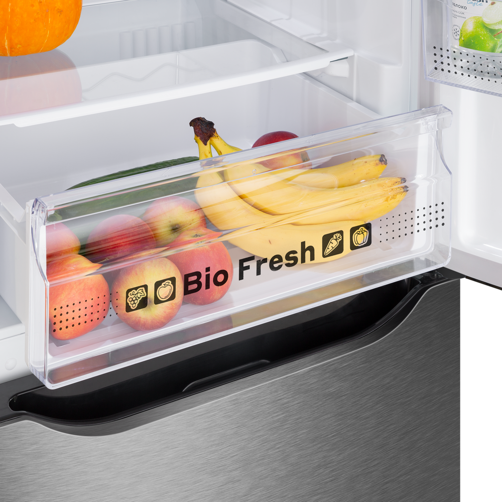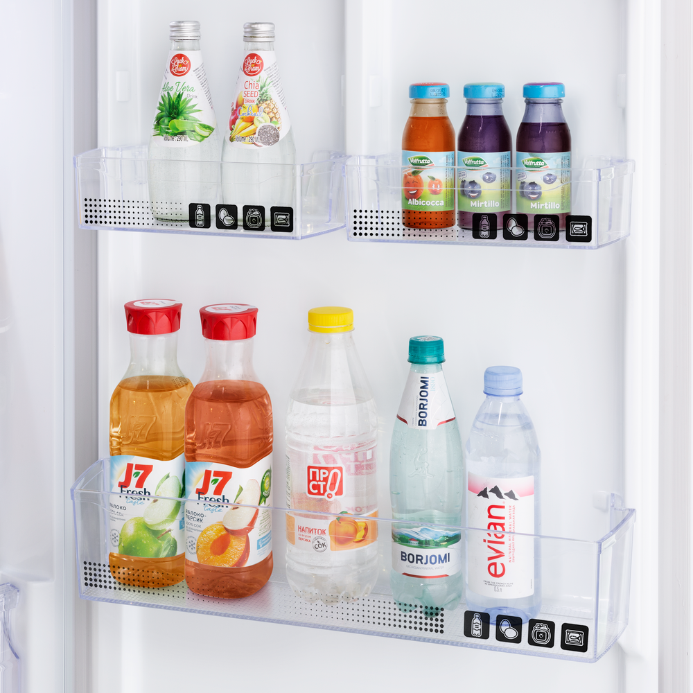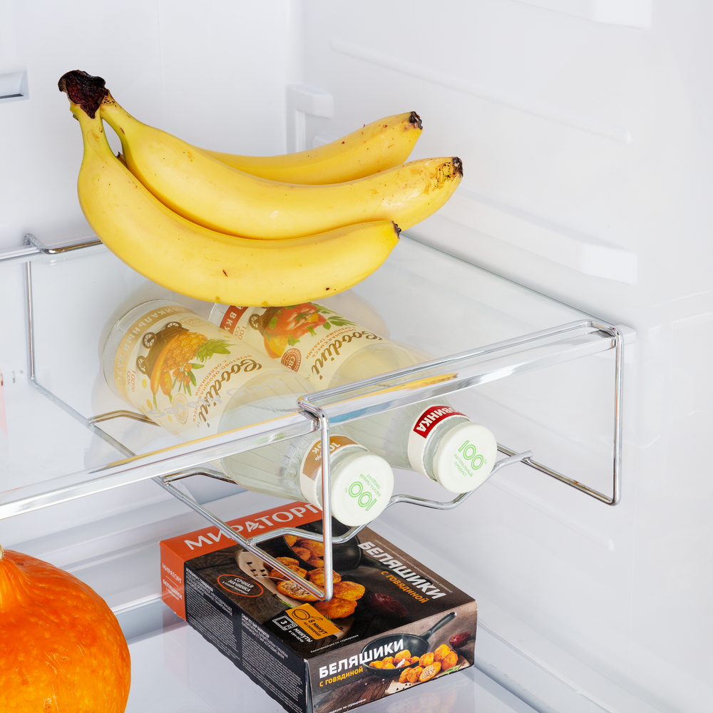 Верхняя холодильная камера объёмом 252 л продуманно разделена: стеклянные полки, большой ящик для фруктов и овощей, боковые полки на дверце и решётка для бутылок помогают поддерживать порядок. Морозильная камера на 98 л со стеклянной полкой и выдвижными ящиками ускоряет доступ к замороженным продуктам. Возможность перенавешивания двери добавляет гибкости при установке.
