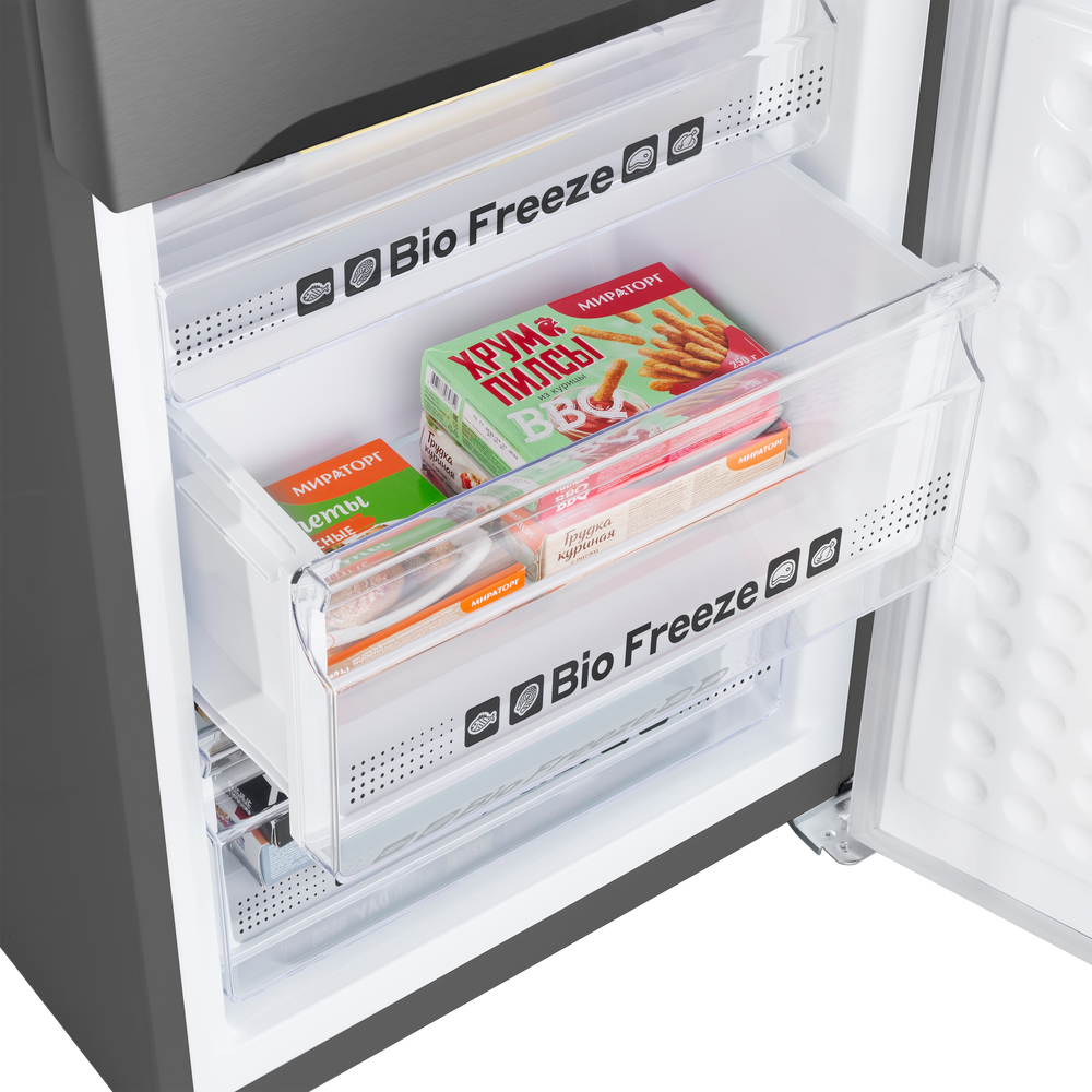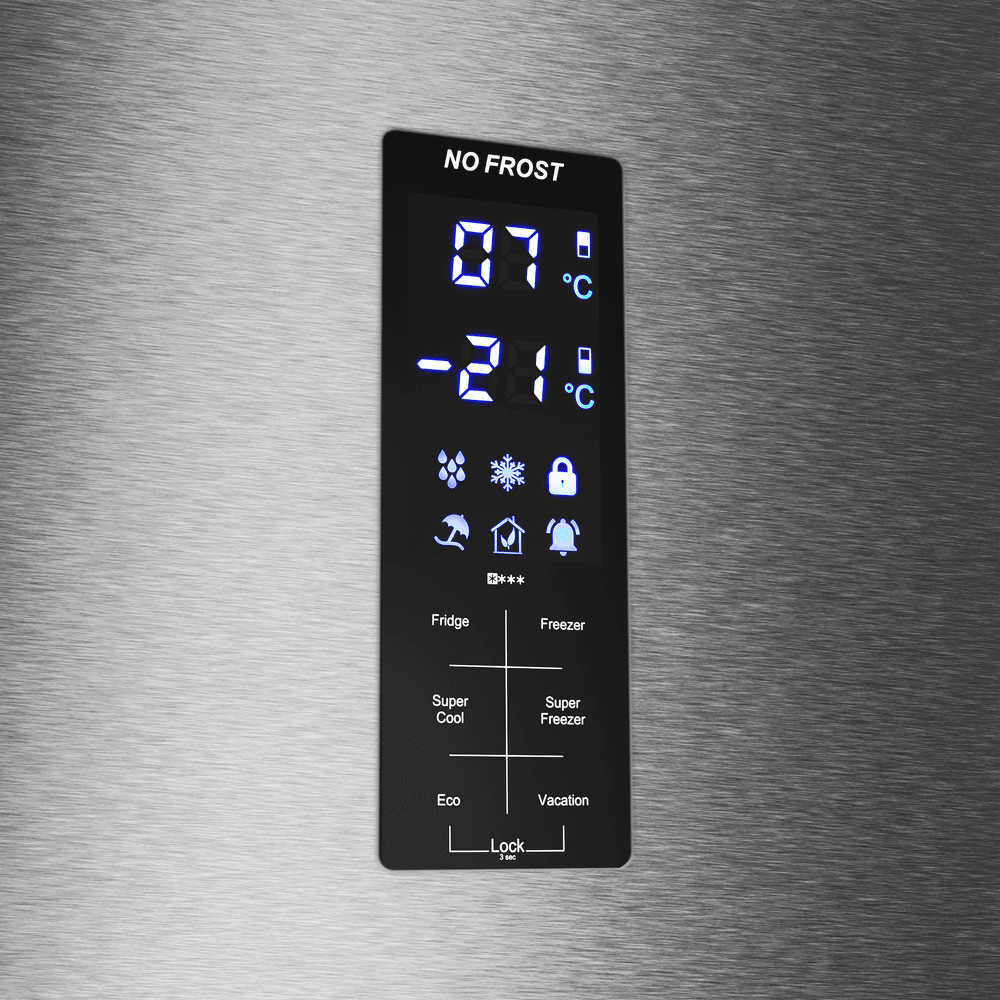 За долгую свежесть отвечает TOTAL No Frost, а инверторный компрессор обеспечивает тихую и плавную работу. Комфортную ежедневную эксплуатацию дополняют режимы Super Cool и Super Freezer, энергосберегающий Eco, а также «Отпуск», когда работает только морозильная камера. Низкий уровень шума 37 дБ делает MAUNFELD MFF195NFIX10 уместным даже на кухне-гостиной, а класс энергопотребления A+ помогает экономить электроэнергию.