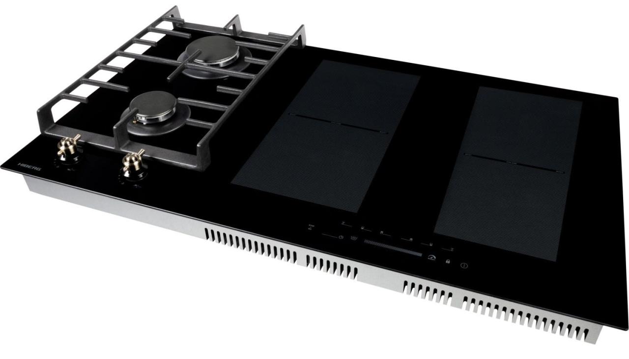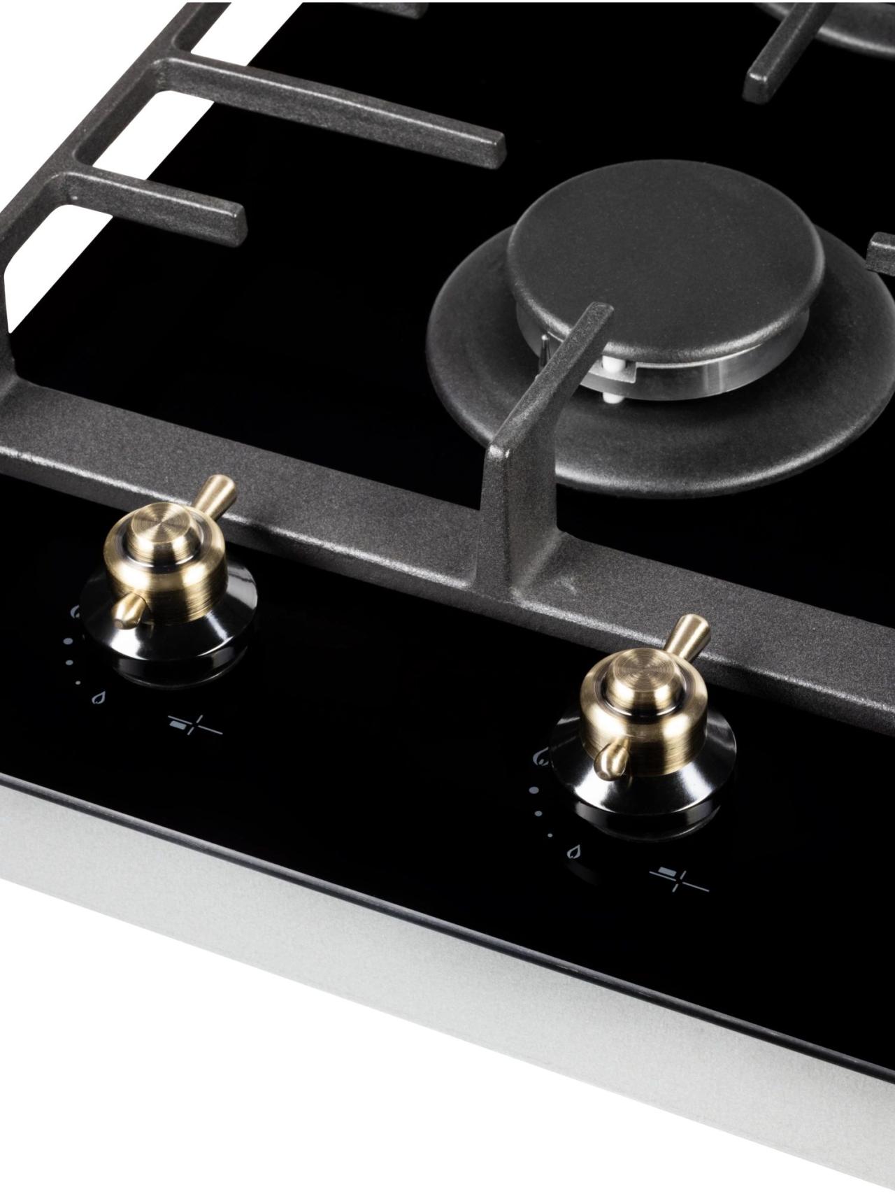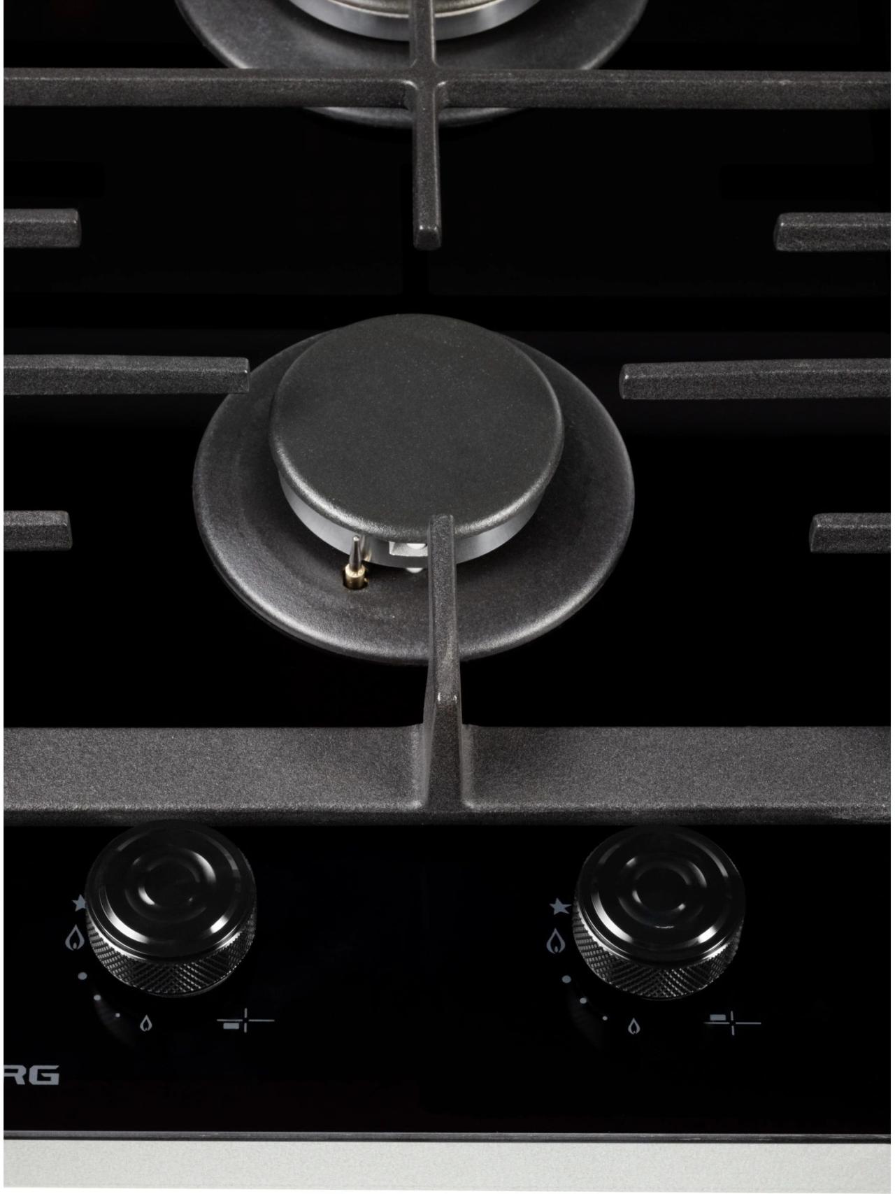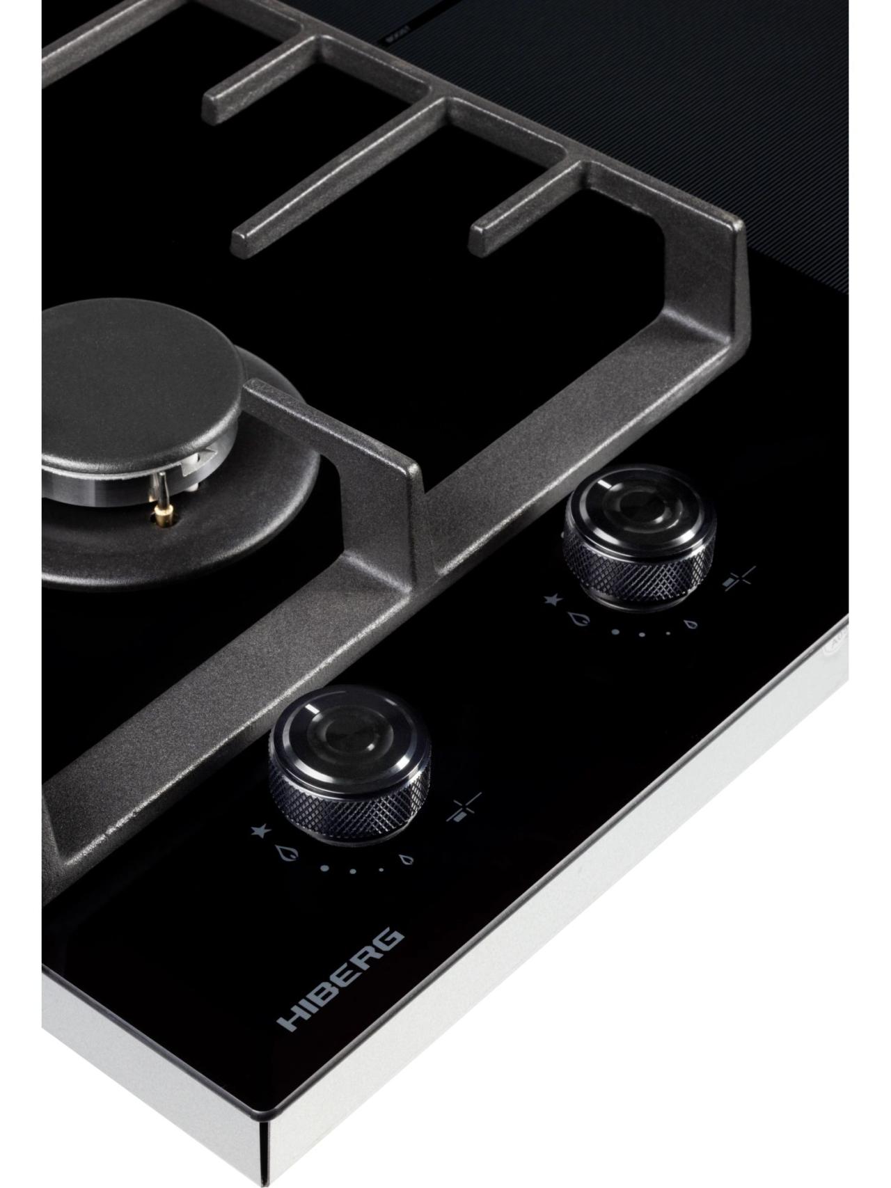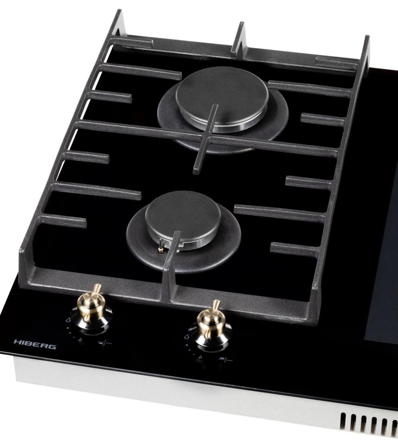 Газовая часть включает две конфорки с автоматическим розжигом от ручки и системой газ-контроля для безопасной эксплуатации. Чугунные решетки обеспечивают устойчивость посуды и рассчитаны на интенсивное использование. Наличие сенсора распознавания посуды и индикатора остаточного тепла добавляет уверенности при работе.