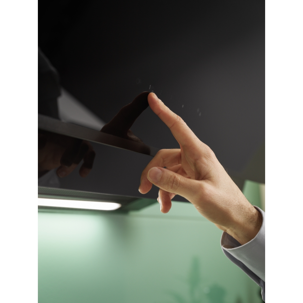 LED-лента с регулировкой интенсивности и теплоты света (1×4 Вт) равномерно подсвечивает варочную панель, создавая комфорт для глаз и подчёркивая эстетику рабочего пространства. В комплект входят угольный фильтр и увеличенный жироулавливающий фильтр, адаптированный к форме корпуса — это упрощает обслуживание и поддерживает стабильную эффективность.