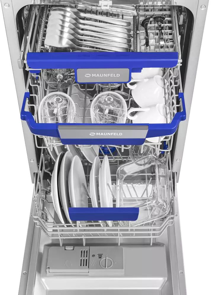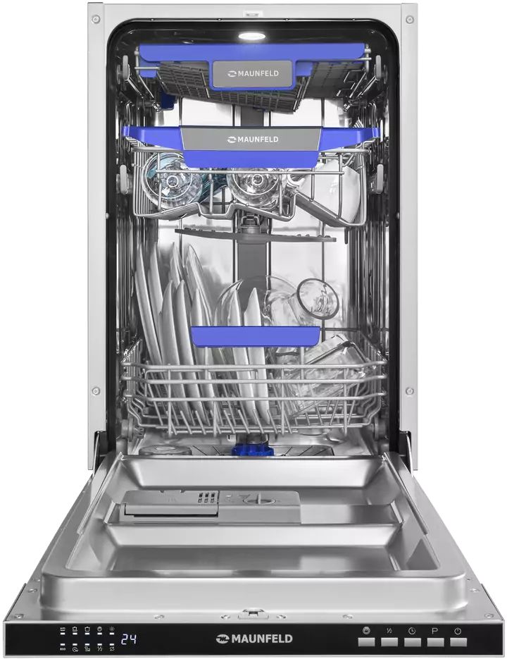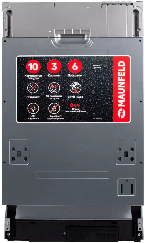 Встраиваемая посудомоечная машина MAUNFELD MLP45230 Light Beam — это узкая, но вместительная модель шириной 45 см (вместо классических 60 см). За раз она может вымыть до 10 комплектов — это оценят в больших семьях, а также те, кто любит готовить и часто принимает гостей.