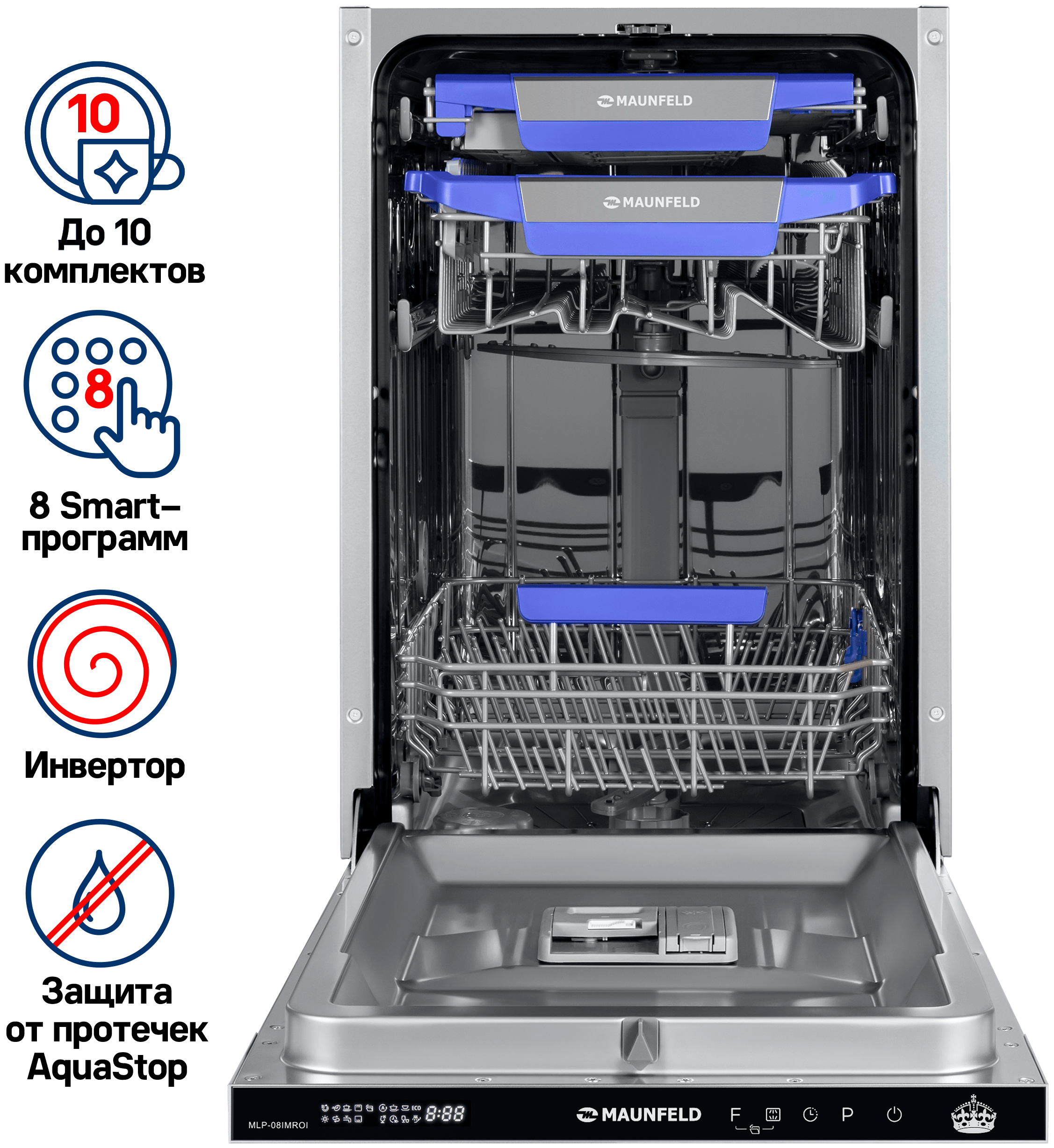 Особенности конструкции - автоматическое открывание дверцы по завершении цикла, внутренняя поверхность из нержавеющей стали, дисплей, использование средств 3 в 1, подсветка камеры, регулируемая по высоте корзина для посуды, таймер отсрочки
