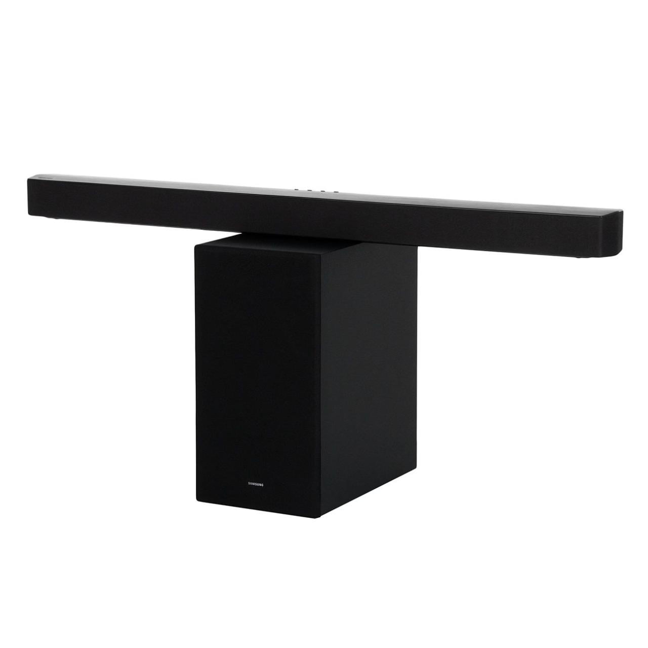 Саундбар Samsung HW-С450 с акустической системой версии 2.1 и общей мощностью 300 Вт обеспечивает получение громкого и объемного звука. К поддерживаемым форматам аудио относятся MP3, AAC, FLAC, WMA, WAV, OGG. Отдельно расположенный сабвуфер активного типа в корпусе из пластика усиливает звучание мелодий и аудиосопровождение видеороликов.