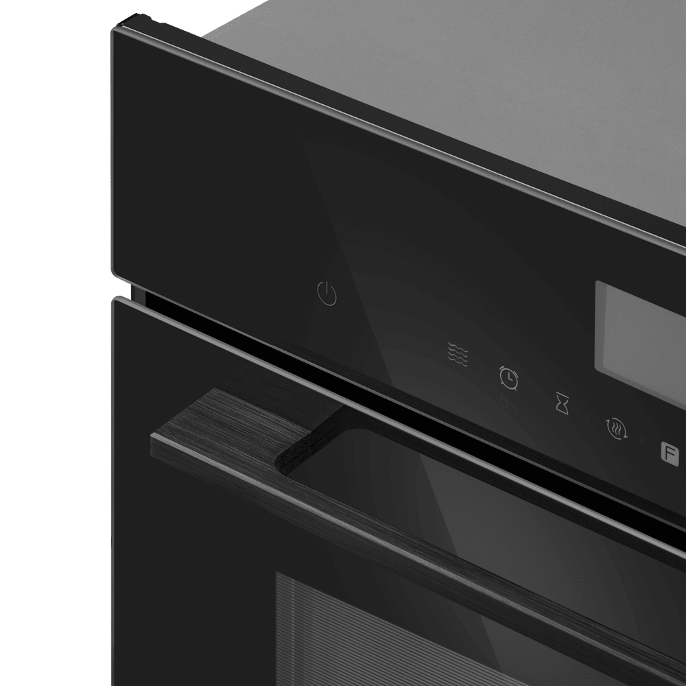 Дизайн с чёрным стеклом и эргономичной ручкой гармонично впишется в современную кухню и будет сочетаться с другой техникой. В комплекте предусмотрены противни, решётка и хромированные направляющие — всё для удобного старта и повседневной готовки.