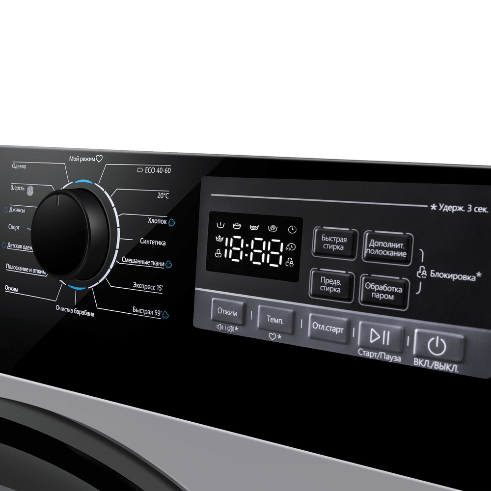 Для освежения вещей и деликатного ухода предусмотрен режим «Обработка паром». Пар глубоко проникает в волокна, помогает разгладить складки, уменьшить запахи и справиться с аллергенами. В наборе программ — «Экспресс 15’», «Шерсть», «Детская одежда», ECO 40-60, «Спорт» и другие решения на каждый день.