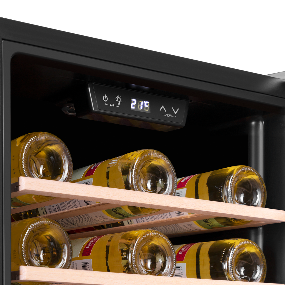 Внутреннее пространство шкафа продумано до мелочей: он оснащен 5 полками из массива бука, которые обеспечивают надежное хранение бутылок. При необходимости полки можно снять и разместить большее количество бутылок.
